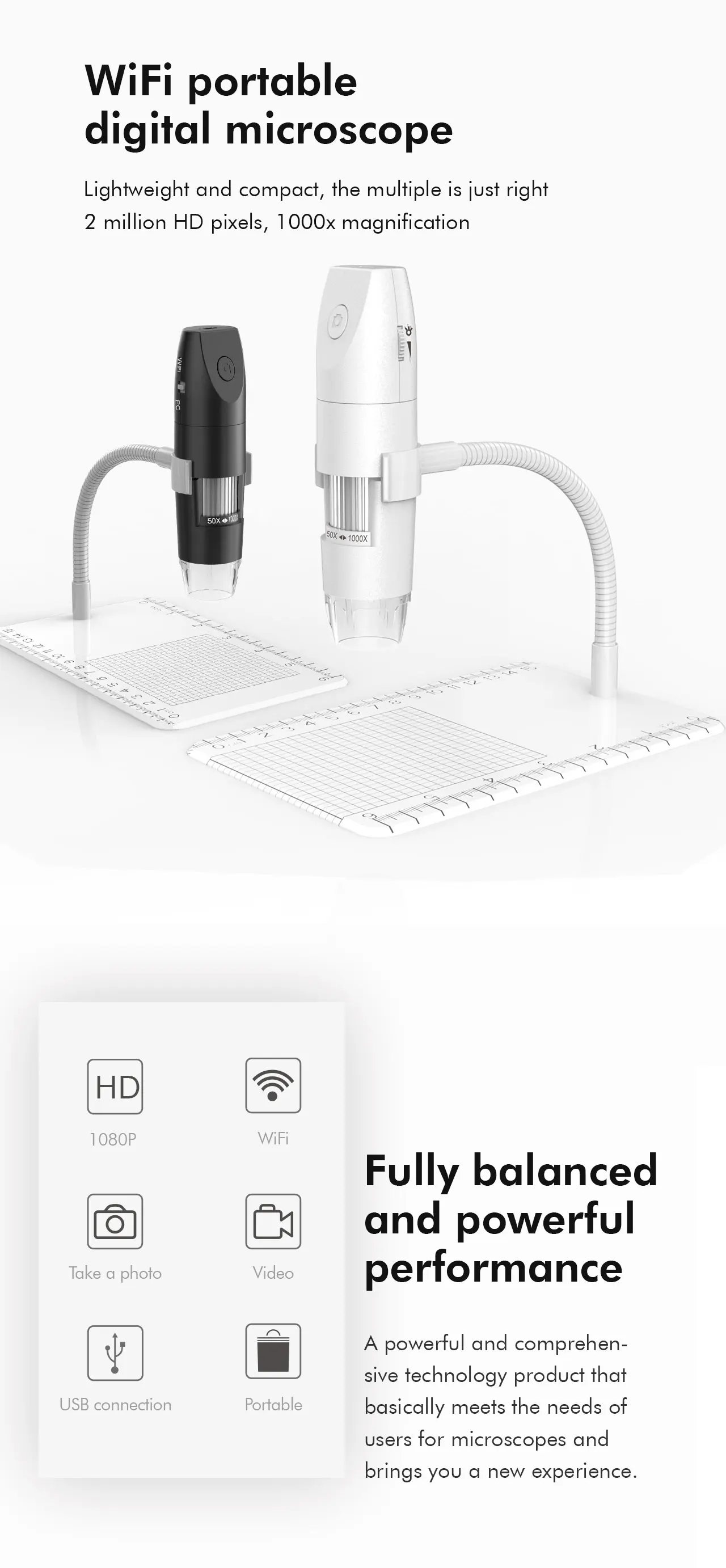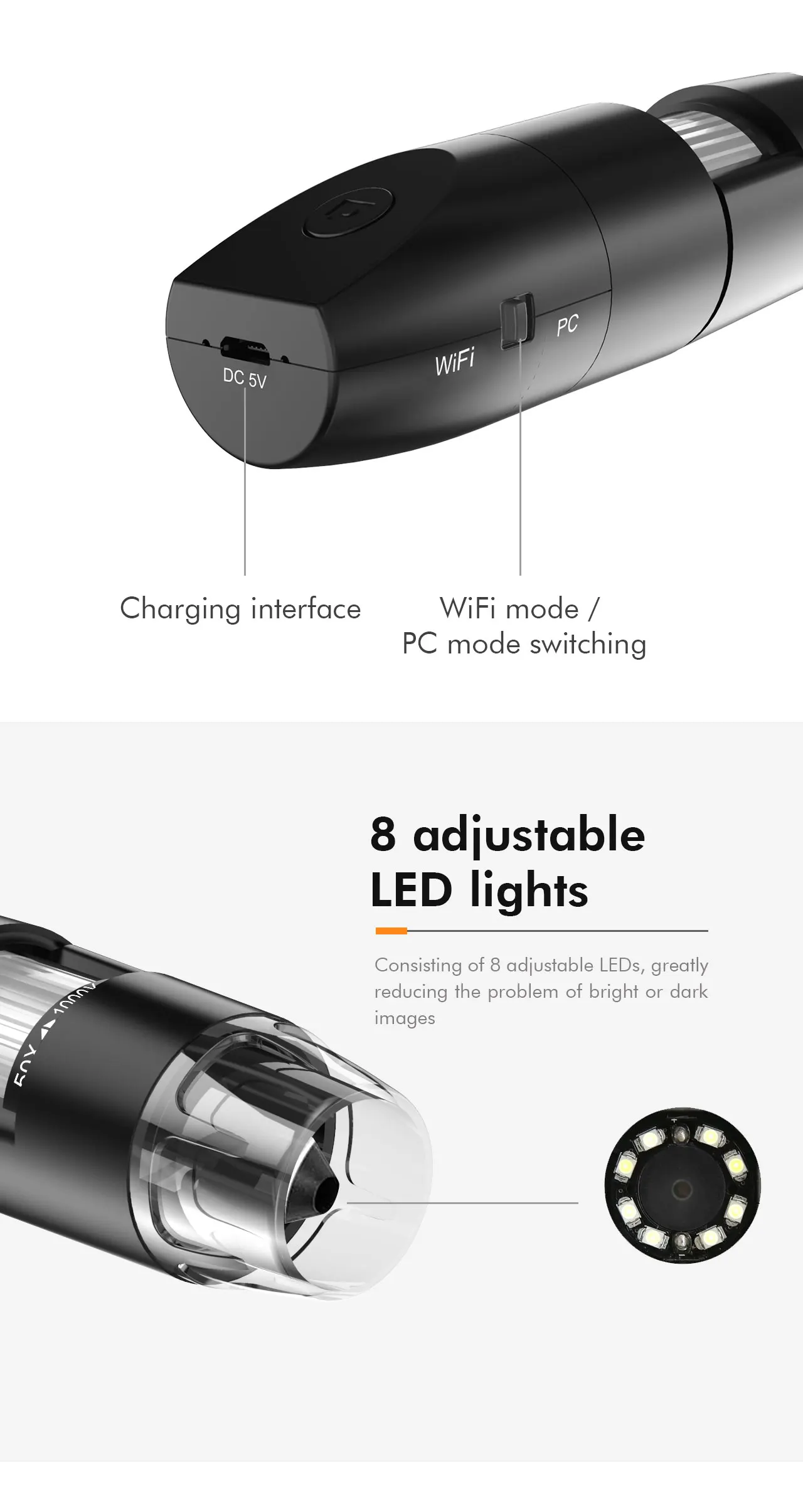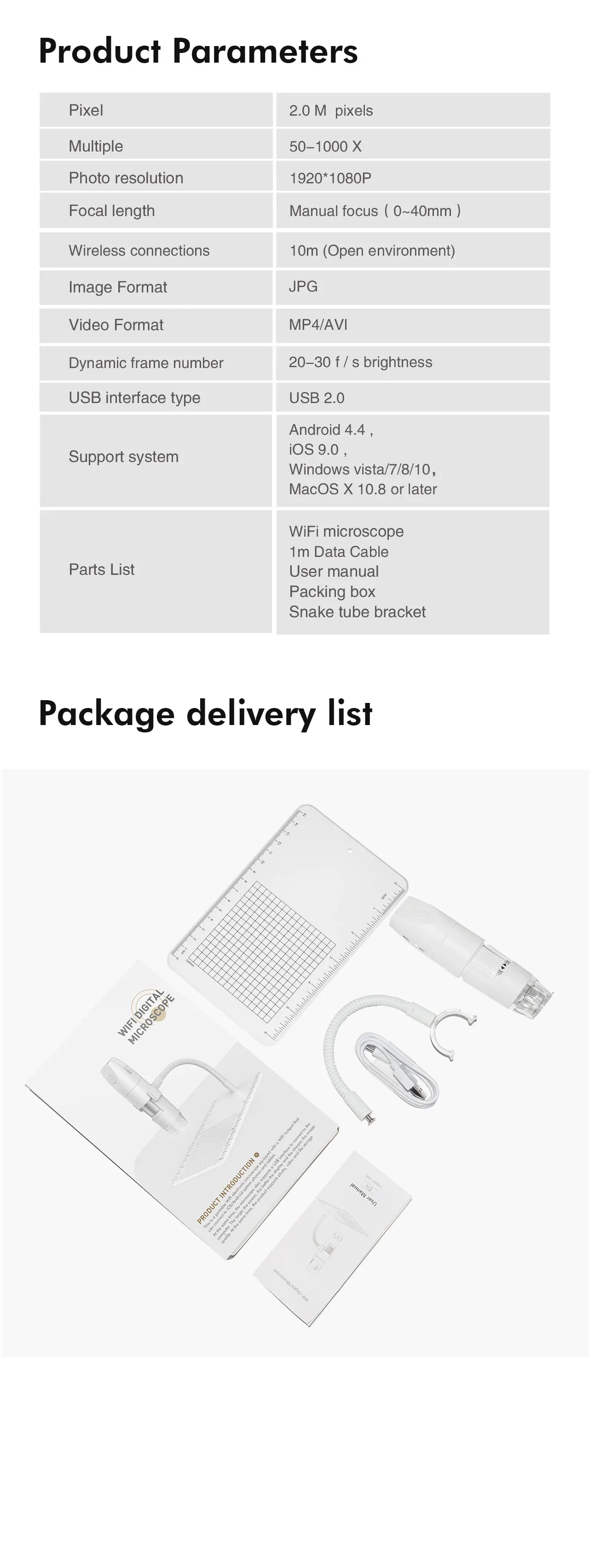 【50X-1000X Wifi Mikroskobu meg 2.0 megapiksel ve 1080P çözünürlük ile 50X - 1000X mikroskop size güzel bir mikro dünyayı kaydetme konusunda harika bir deneyim sunar. Android 4.3+, IOS 8.0+ ve Windows Vista / 7/8/10, MacOS X 10.8+ işletim sistemlerinde wifi üzerinden çalışabilir.