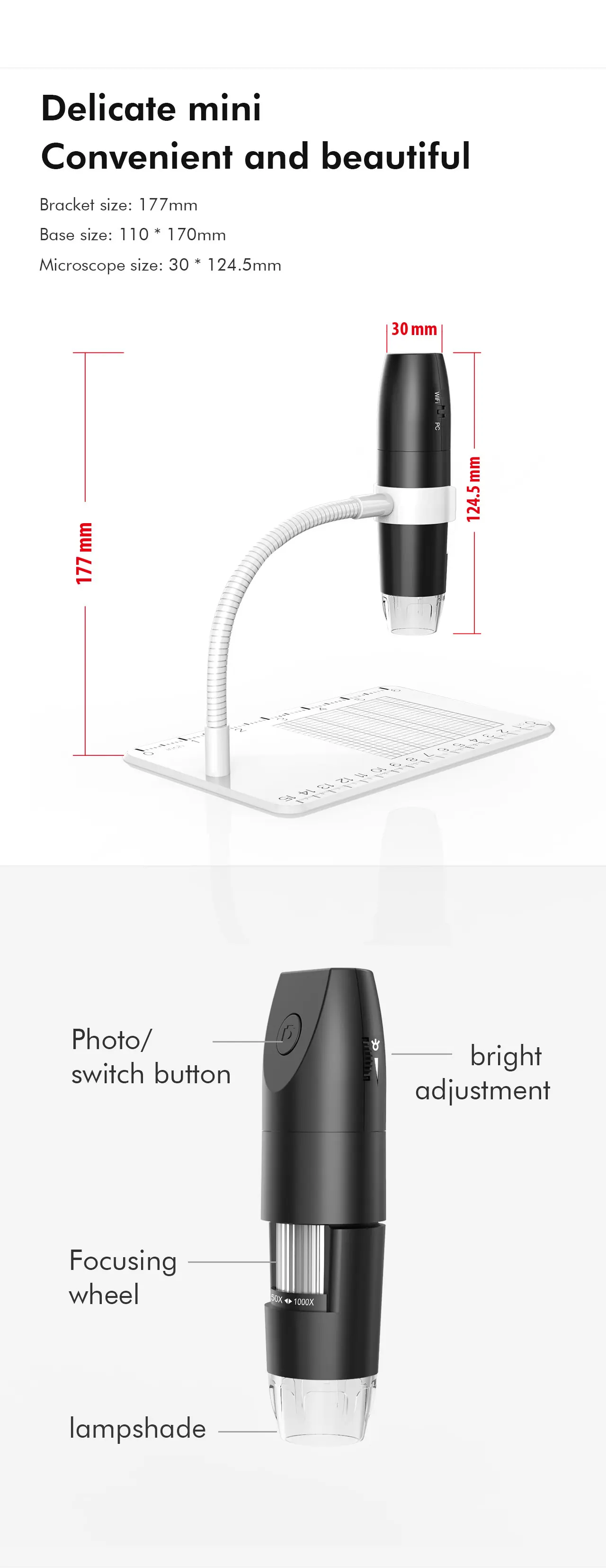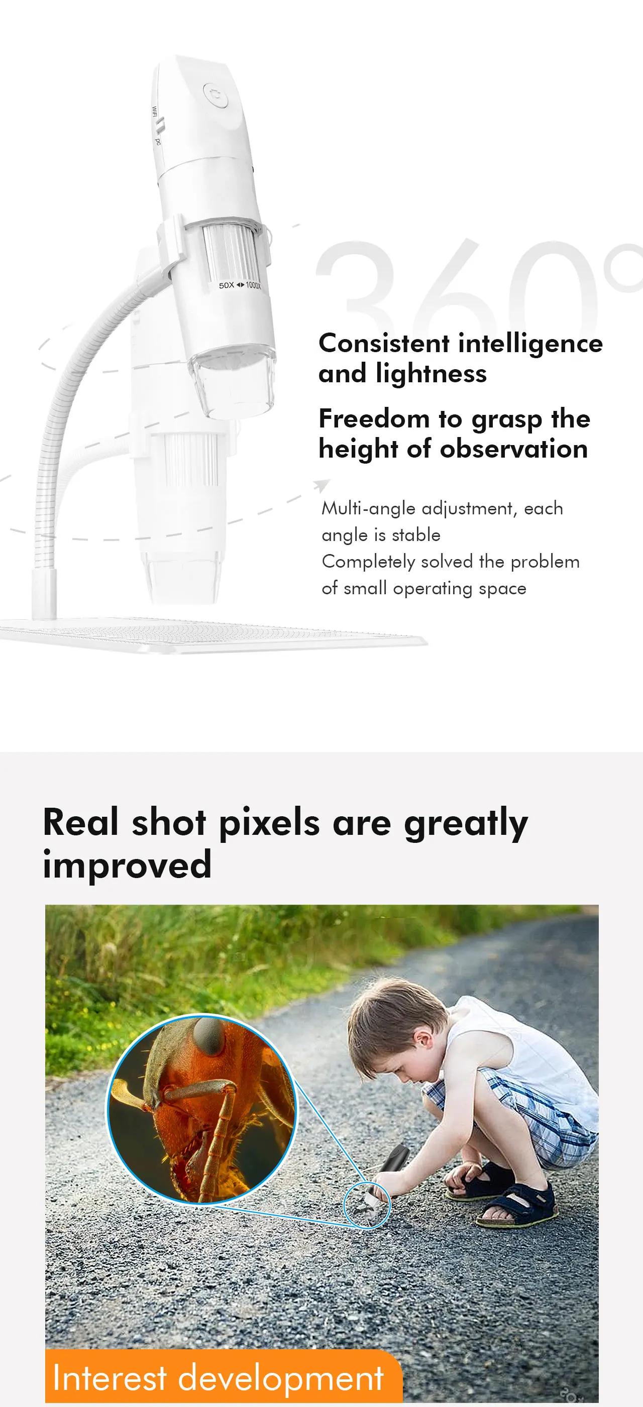 Taşınabilir ve kompakt, 2 milyon yüksek çözünürlüklü piksel, 1000 kat büyütme.